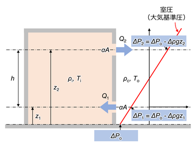 図1に室内温度が室外温度より高い場合、温度差によって生じる単一開口部の風速勾配を示す。ここで、高さ方向z軸を変数とした圧力勾配は式[2]により定義され、摩擦のない理想の状態(frictionless)で外部へ流出される気流勾配は式[3]によって定義される。